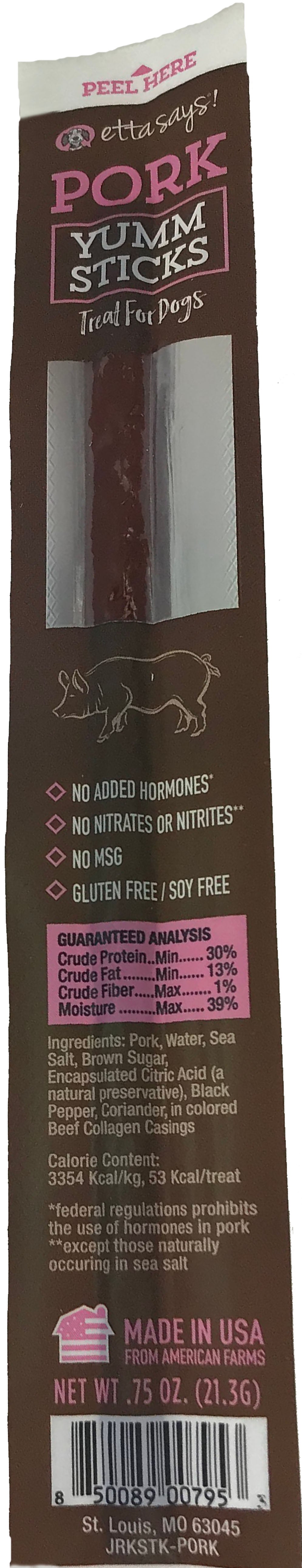 Etta Says! Pork Yumm sticks are packed with flavor and protien to keep your dog fueled for whatever adventure he goes on. 100% human grade meat stick with high protein and low fat. Each yumm stick is individually wrapped for easy on the go convenience. Keep some handy in your, car, bag or backpack for a treat you can both enjoy.